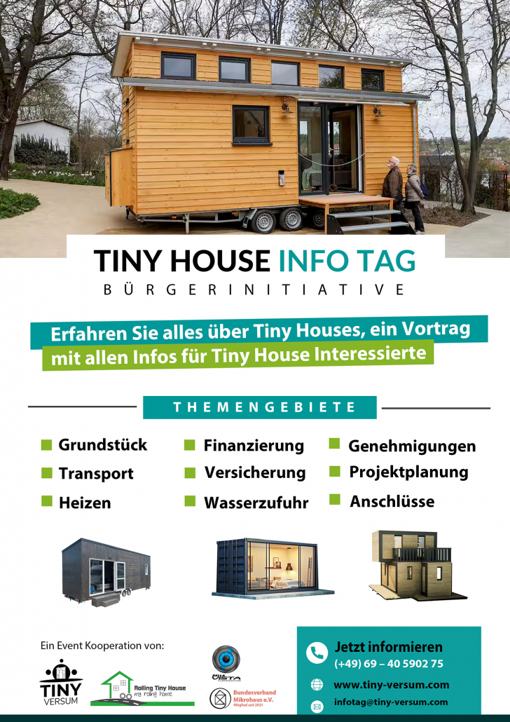 Melden Sie sich noch heute an und erhalten Sie das Vertrauen, das Wissen und die Antworten, um Ihre Tiny-House-Träume in die Realität umzusetzen. Die Veranstaltungen finden Sonntags statt und werden in der Zeit zwischen 16:00 – 18:00 Uhr organisiert. Schicken Sie uns direkt eine E-Mail an infotag@tiny-versum.com