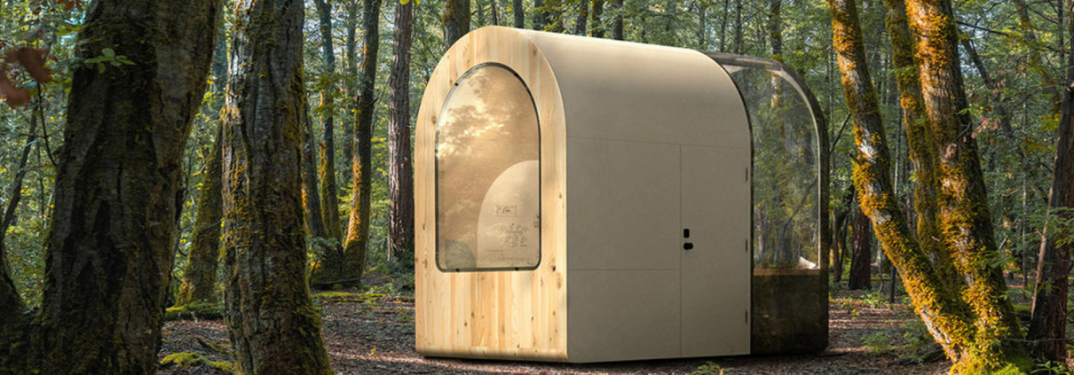 Bei der Gestaltung dieses 3D-gedruckten Archetyp-Smartpods von Denizen wurde jedes Detail berücksichtigt, um Benutzern die ideale Remote- Office- Umgebung zu bieten. Die vorgefertigte Kabine ist so gestaltet, dass sie Inspiration und Produktivität fördert. Sie verfügt über ein schlichtes, aber elegantes Interieur, das komplett mit allen wichtigen Dingen sowie funktionalen High-Tech-Lösungen ausgestattet ist. Der Pod kann an jedem gewünschten Ort aufgestellt werden und ist im Abonnement für Arbeitgeber erhältlich, die einen alternativen, naturnahen Arbeitsplatz erleben möchten.